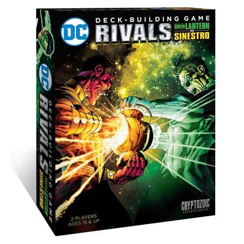 Players take on the roles of Green Lantern and Sinestro. Each oversized character card has a cost of 9, 12, or 15 and has a unique ability. As they are defeated, the characters grow in difficulty to take down, and their abilities also improve. Players start off on an even playing field with identical decks of cards. They then use the cards in their hands and special abilities to buy bigger and better cards. As the game progresses, each player’s deck becomes unique, strengthened by his or her decisions. Players attack and defend until Green Lantern or Sinestro stands supreme over his iconic rival!
