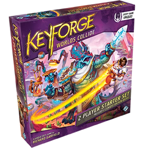 Along with this new set of KeyForge comes a wide variety of ways for you to jump into the game. In addition to the individual KeyForge: Worlds Collide Archon Decks, this set also offers the KeyForge: Worlds Collide Two-Player Starter Set, which provides you with all the tools you need to either begin or expand your adventures on the Crucible, including two unique Worlds Collide Archon Decks, a Quickstart Rulebook, two poster playmats, and all the keys, tokens, and chain trackers two players need to start playing.